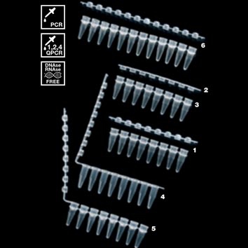 Tiras de 8 tubos de 0,2ml y tiras de 8 tapones redondeados.