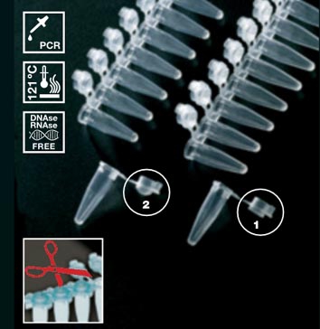 Tiras (2) de 8 tubos de 0,2ml y tiras de 12 tapones unidos redondeados, caja 125 tiras
