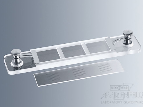 Con cubreobjetos con 3 retículos de 10 x 10 mm subdivididos en 10 rectángulos.
