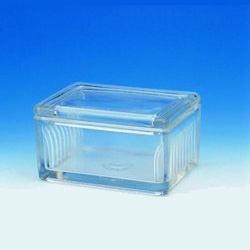 Cubeta tinciones para 10 porta-objetos según Schiefferdecker Fabricada en vidrio prensado. Gran resistencia. Tapa de vidrio. Para portas estándar 76x26mm. Capacidad 10 portas en horizontal. Capacidad 20 portas espalda con espalda. Referencia: 614500 Marca: Simax « Volver