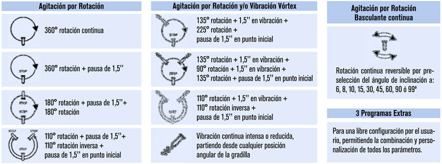 De gran versatilidad, dispone de 20 programas de agitación: por rotación, rotación reversible, basculante y vibración vórtex.