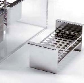Gradilla inox. 50 microtubos 11Ømm. para cubeta Clini-term Fabricada en chapa de acero inox. AISI 304. Capacidad: 50 microtubos de 11Ømm. Referencia: 1000546 Marca: JP Selecta « Volver