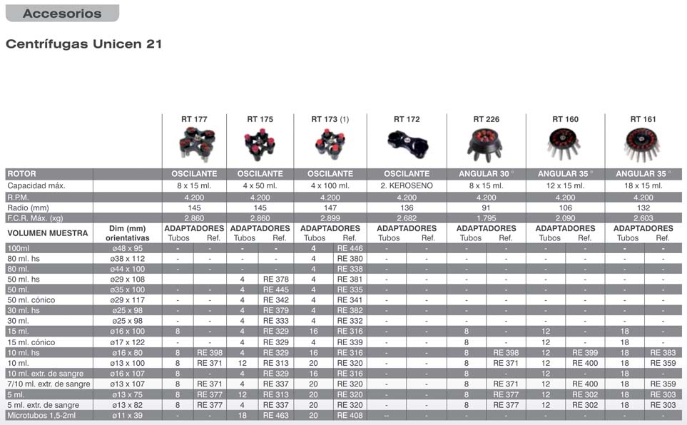 Rotores, adaptadores y tubos, accesorios no incluidos con el equipo. Se tienen que pedir aparte.