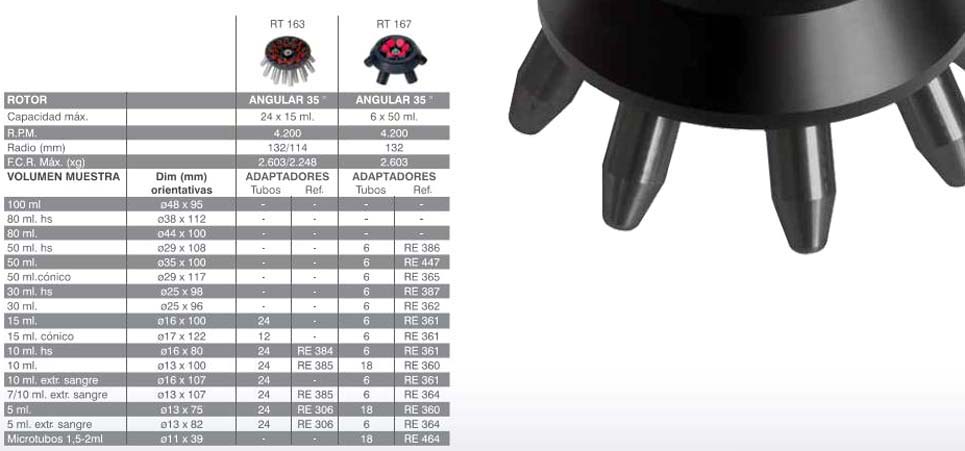 Máx. capacidad de 4 tubos de 100 ml, llegando a alcanzar un máx. de 4.200 R.P.M./2.899 xg, con 9 rotores intercambiables y hasta 40 tipos de adaptadores diferentes, llegando a cubrir los requisitos fundamentales de separación en gran parte de clínicas, industrias, centros de investigación…