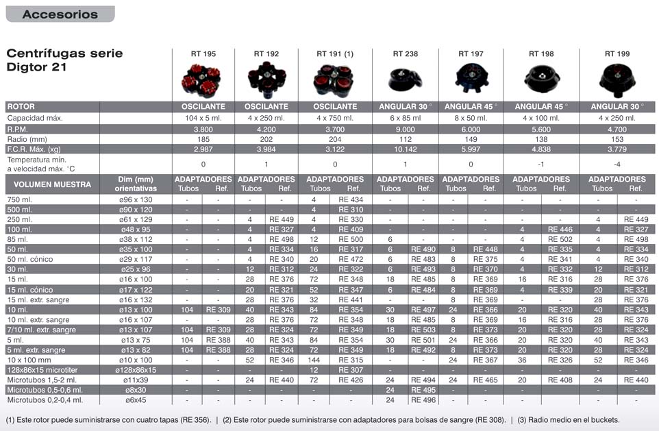 Rotores, adaptadores y tubos, accesorios no incluidos con el equipo. Se tienen que pedir aparte.