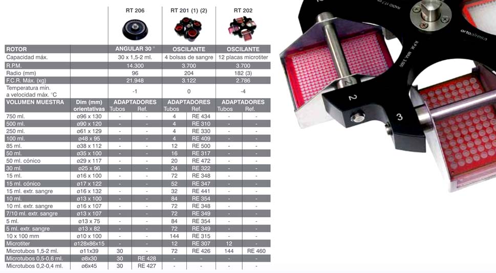 - Versatilidad: desde 4 x 750 ml, 52 tubos cónicos de 15 ml, rotor para micro placas, de Microtubos, y un gran número de adaptadores en todos ellos.