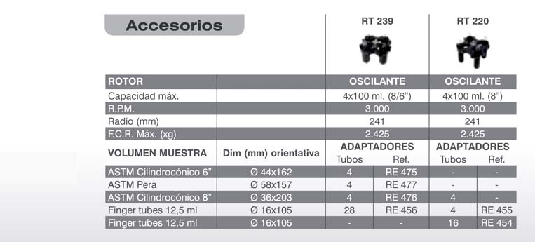 Dispone de accesorios para centrifugar tubos cilindro-cónicos de 6 y 8 pulgadas, tubos de pera de 6 pulgadas y tubos para elementos traza de 12,5 ml.