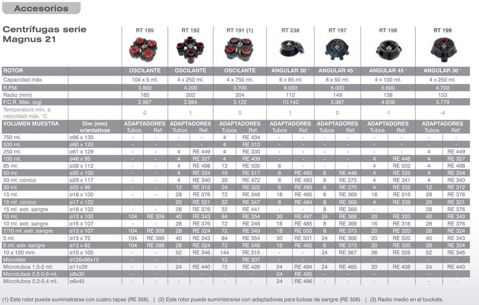 La centrífuga Magnus 21 puede trabajar con volúmenes de 4 x 750 ml, 4 bolsas de sangre, 72 tubos de 15 ml, 20 tubos de 50 ml cónicos y 52 de 15 ml cónicos, rotor para micro placas, de microtubos, y un gran número de adaptadores en todos ellos.