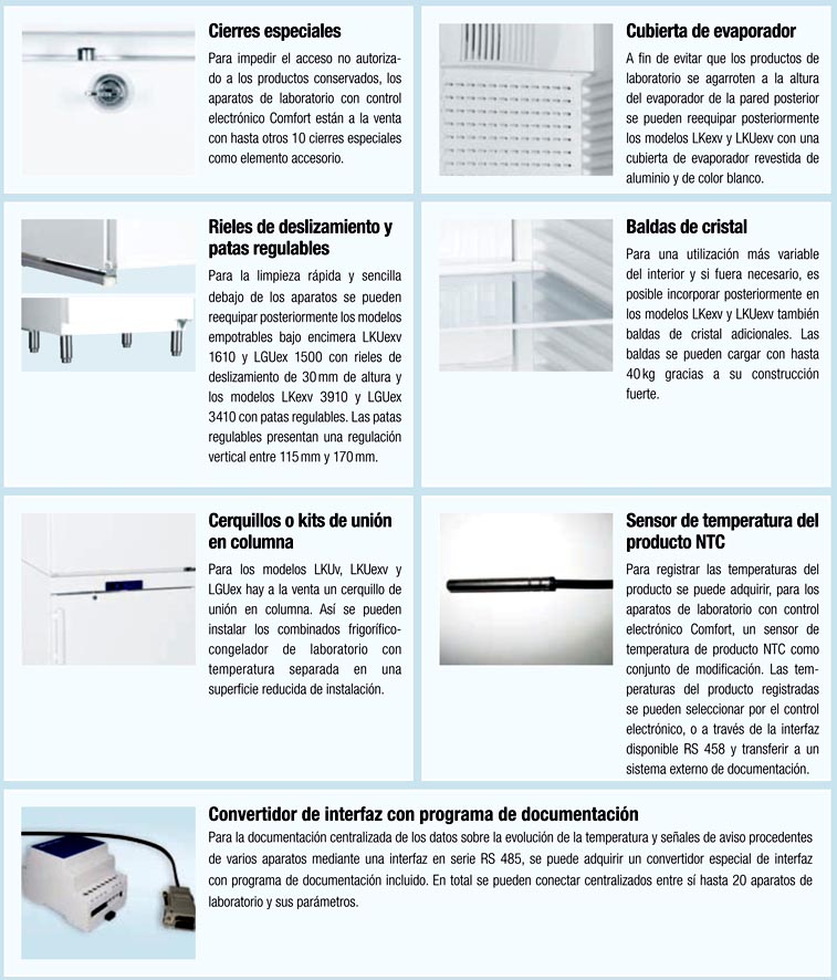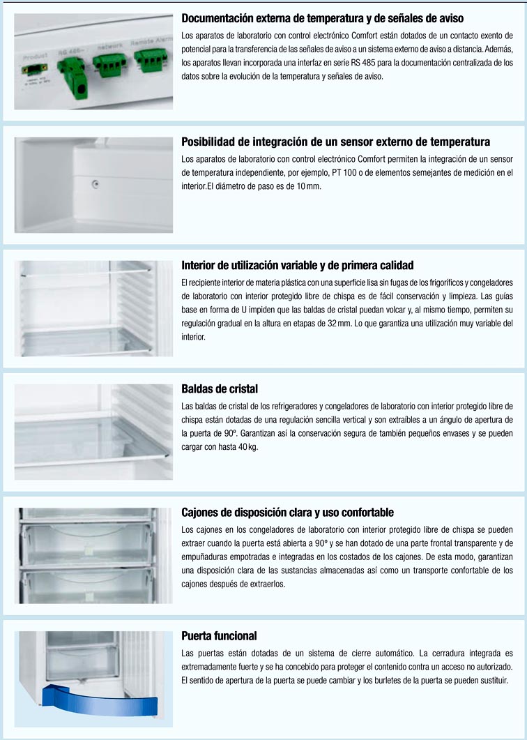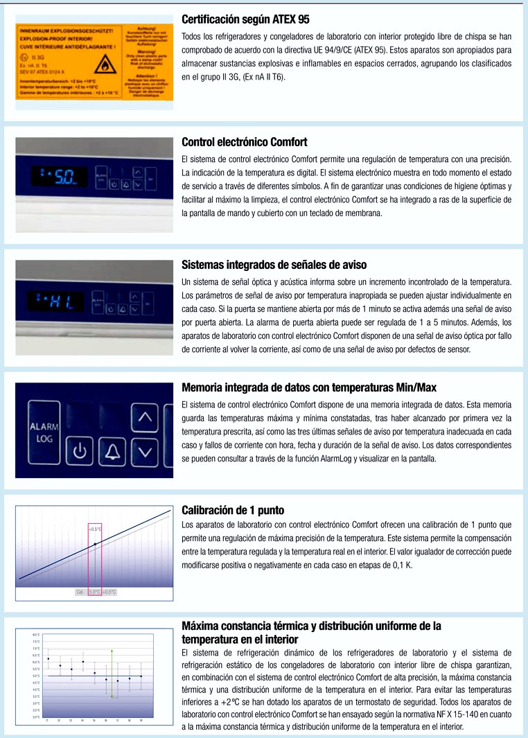 El programa de laboratorio con control electrónico Comfort incluye 2 refrigeradores y 2 congeladores con un interior protegido libre de chispa que se han concebido especialmente para el almacenamiento de sustancias y/o materiales inflamables y explosivos, por ejemplo, en la industria química o en laboratorios especiales.