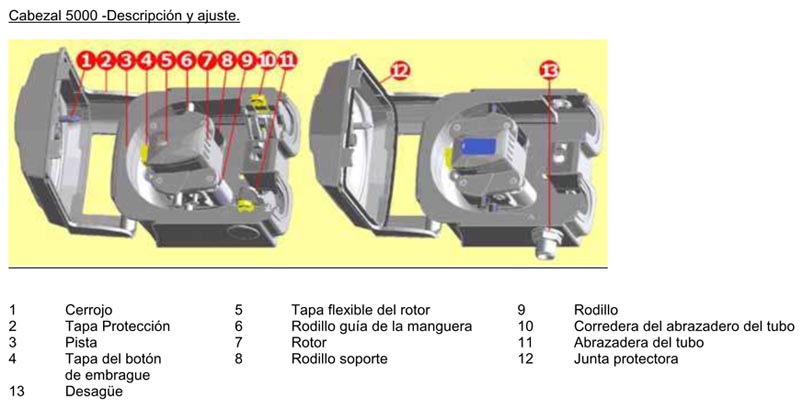 Cabezal 5000-2r, con rotor de dos rodillos auto ajustables, recomendable en trabajos muy continuos. Tapa con bisagra para cambio rápido de tubos. Admite toda la gama de tubos hasta 9,6mm.