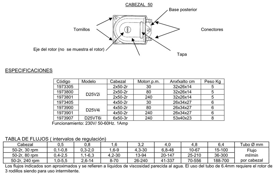 - Caudal variable de 0,1 a 100,0 ml/minuto. (Según tubo utilizado, por cabezal.)