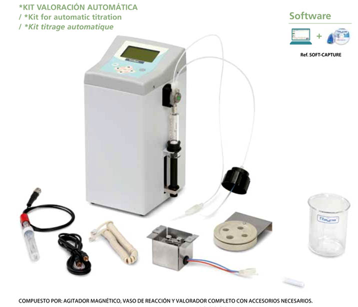 Compuesto por: Agitador magnético, Vaso de reacción y Valorador completo con accesorios necesarios.
